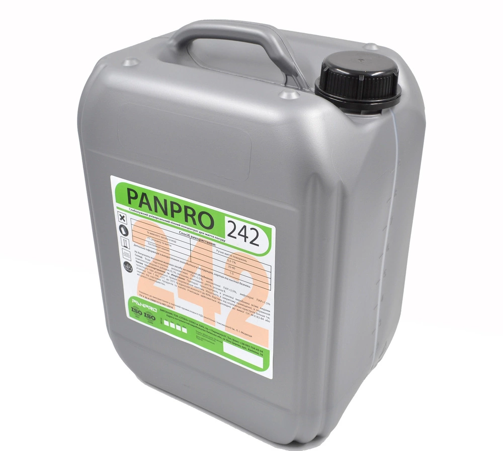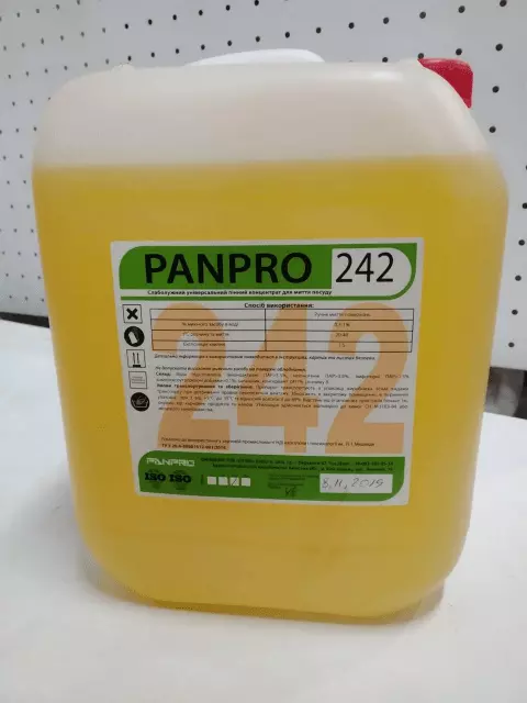 PANPRO 242 з pH 7,0-9,0. - універсальний миючий засіб, який добре піниться та має аромат лимону. Засіб підходить для ручного миття жирного посуду зі скла, міді, алюмінію або пластикових поверхонь.